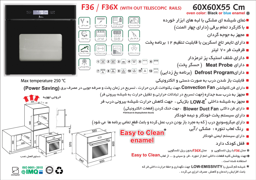 فر F36 اخوان دارای درب الکترونیکی است.درب فر به صورت افقی و از بغل باز می شود.