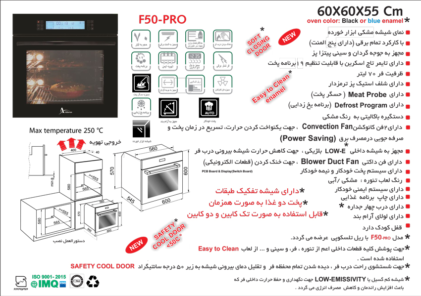 جدیدترین محصول اخوان در دسته فر توکار آشپزخانه، فر برقی دو طبقه 70 لیتری مدل F50pro می باشد که با ویژگی های جذاب خود به آخرین مدل از فرهای برقی اخوان بدل گشته است.
